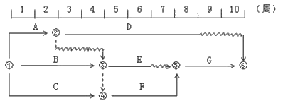 某工程时标网络图如下图所示。计划执行到第5周末检查实际进度。发现D工作尚需3周完成,E工作尚需1周完成,F工作刚刚开始。