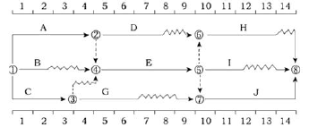 某工程双代号时标网络计划如下图所示,其中工作B 的总时差和自由时差( )。