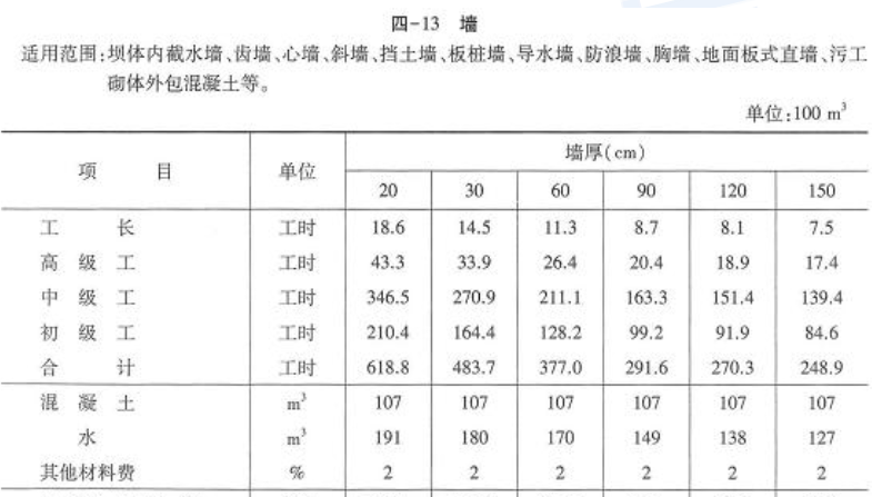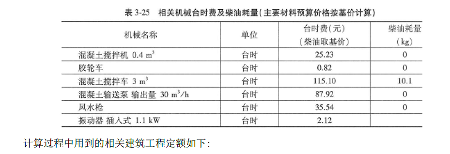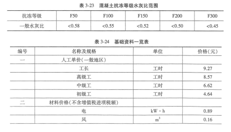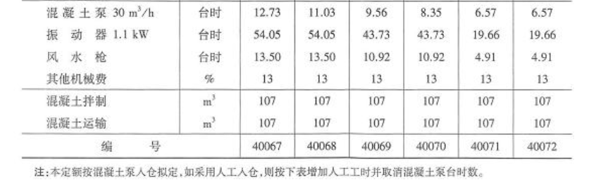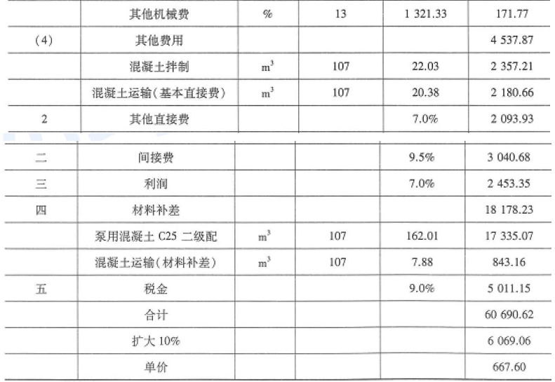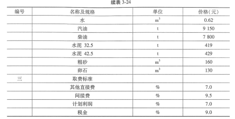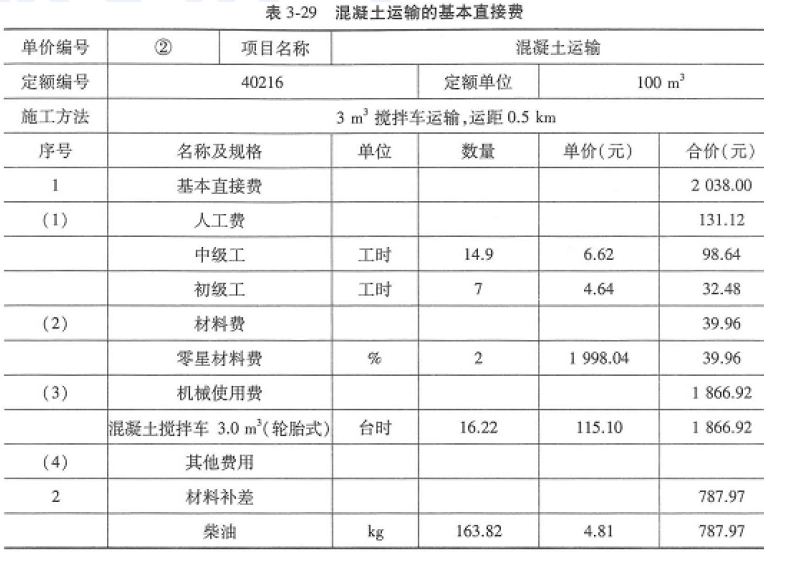 由表3-29 可知,混凝土运输的基本直接费为2038.00÷100 = 20.38 (元/m3),这一工序的材料补差为787.97÷100=7.88(元/m3)。