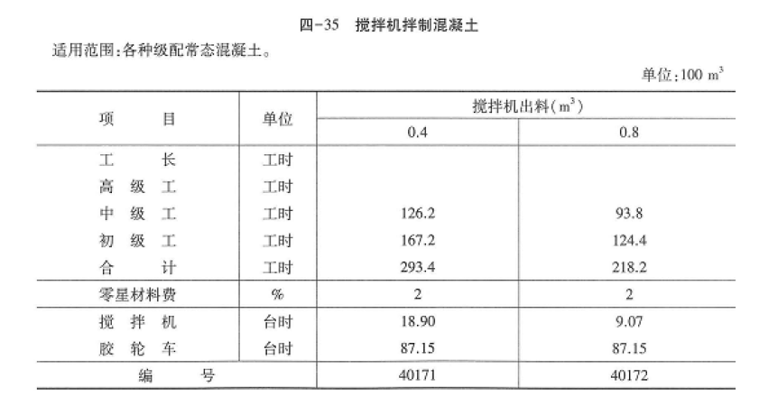 根据题干可知,混凝土采用0.4 m3搅拌机搅拌,混凝土搅拌的基本直接费计算参照定额40171,如表子28 所示。