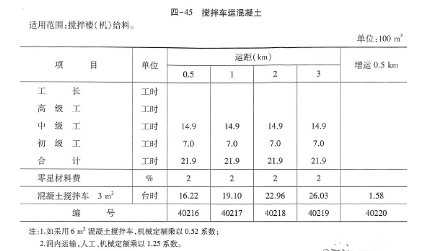根据题干可知,混凝土采用3 m3混凝土搅拌车运输0.5 km, 混凝土运输的基本直接费计算参照定额40216,如表3-29 所示。