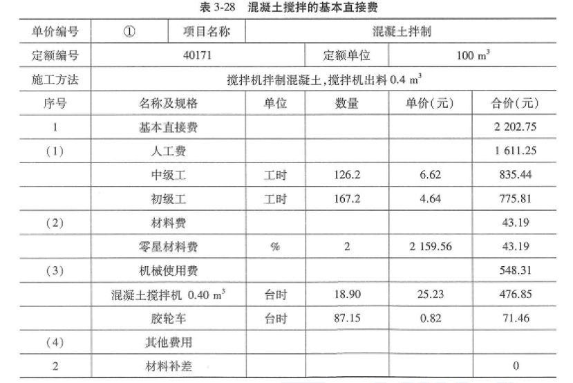 由表3-28 可知混凝土搅拌的基本直接费为2202.75÷100=22.03(元/m3),这一工序的材料补差为0。