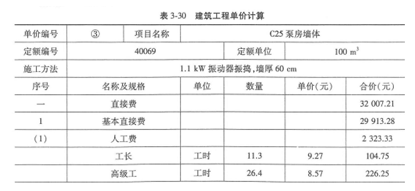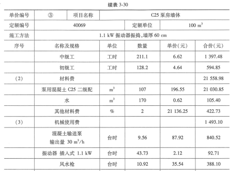 由题干可知,混凝土墙厚60 cm,采用混凝土泵送,其建筑工程单价计算参照定额40069,如表3-30所示。