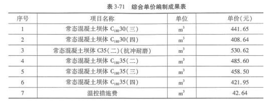 常态棍凝土坝体Cl 8035(四)综合单价=421.95 +42.64 =464.59(元/m3)