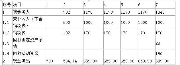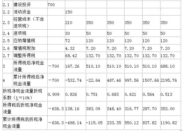 2.项目静态投资回收期(所得税后)=(4-1)+|-22.64|/510.10=3.04(年),小于基准投资回收期为6年,建设项目财务净现值为1190.82万元,大于零,所以该项目可行。