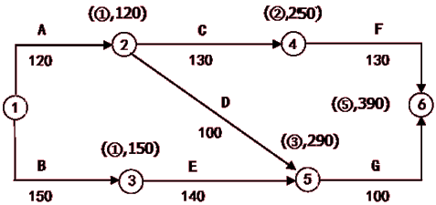 关键路线:①→③→⑤→⑥,计算工期为390天,按此计划该工程可以按合同工期要求完工。 (4分)