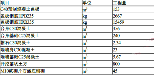 问答题 某省新建一条四车道一级公路,有一处6×4.8钢筋混凝土盖板涵,预制盖板尺寸为6m,宽1.0m,高0.5m,集中预制,起重机安装。结构进出口均为八字墙,其施工图设计主要工程数量见下表:
