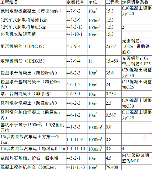 注:盖板预制场运距1.77km,弃方3.2km,15t自卸汽车运输,1.0m3挖掘机开挖基坑,钢筋混凝土盖板按2.6t/m3计。混凝土搅拌机拌合,容量为500L。