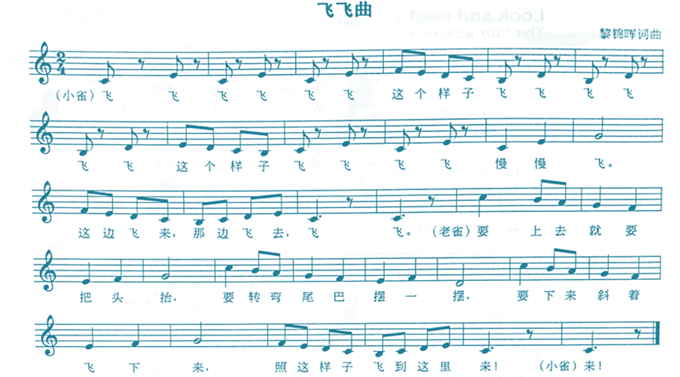 第二乐段与第一段形成对比关系,使用了高八度的主音,展现了老麻雀在教授小麻雀飞行中那种长着的姿态。最后一个乐句又与第一乐段最后一句形成再现关系。
