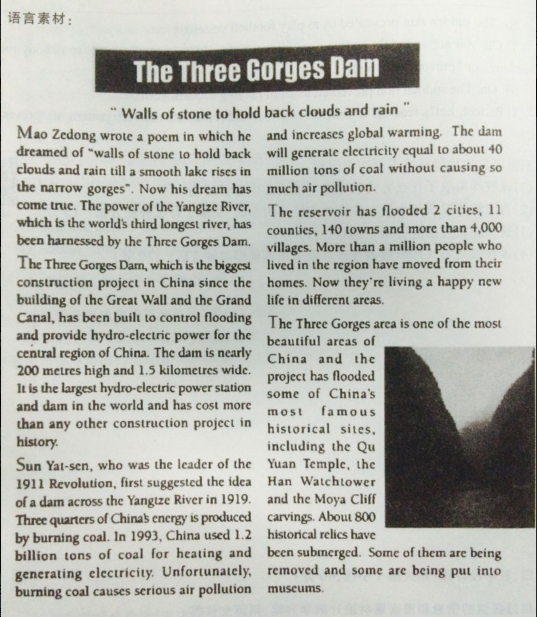 1. Show a poem of Mao Zedong on PPT:Walls of stone to hold back clouds and raintill a smooth lake rises in the narrow gorges.Students guess which placeit is. Then show some beautiful pictures of the Three Gorges Dam.