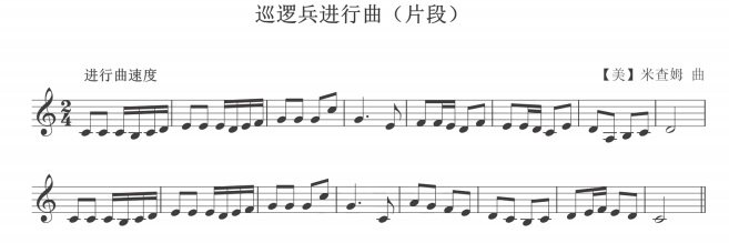 3.教师借助多媒体课件介绍作品的背景知识:《巡逻兵进行曲》又称《美国巡逻兵进行曲》是一位名叫米查姆的美国陆军士兵创作的,他以自己所从事的事业为傲,于是创作出这首流芳百世的作品。