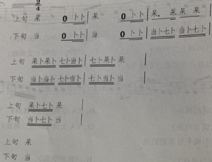 下面谱例出自锣鼓经片段,这种句幅递减的创作手法为( )。