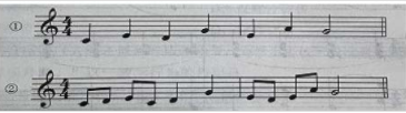 下列谱例中,②是①的变化形式,它运用了哪种旋律发展手法? A.加花变奏 B.节奏缩小 C.节奏扩大 D.倒影模仿