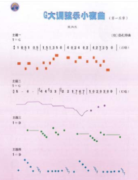 3.完整欣赏《G大调弦乐小夜曲》(第一乐章)。一边欣赏,一边利用课件展示不同主题的旋律线条,引导学生熟悉主要的音乐主题。