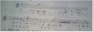 下面谱例出自朱践耳的作品,它以柳宗元的诗为题材,采用了交响乐队与京剧老生吟唱的形式,该作品是