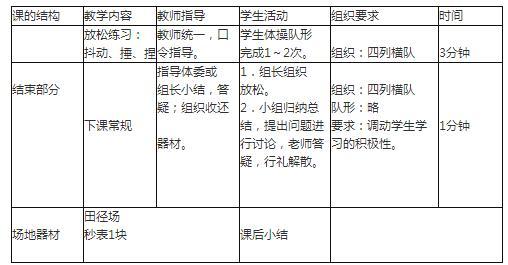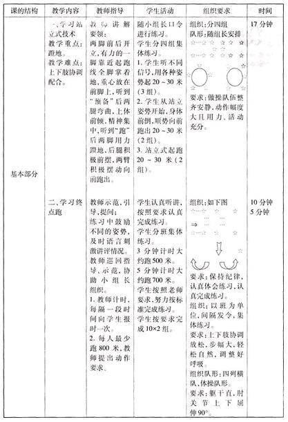 案例题 阅读下列材料,设计一节45分钟的课堂教学,请写出基本部分的教学目标、教学方法和教学过程。 教学条件:田径场,秒表