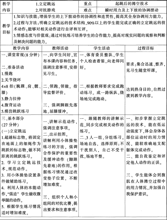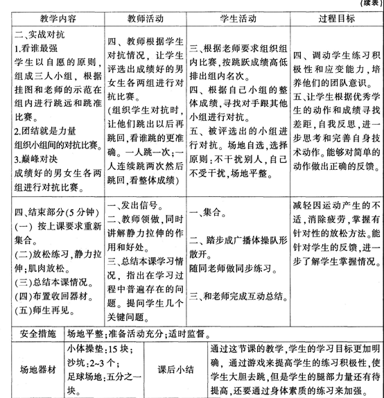 案例题 阅读材料,根据所提供的条件进行教学设计。 水平四,初中三年级八班,人数:45。 教学内容:立定跳远。 教学条件: