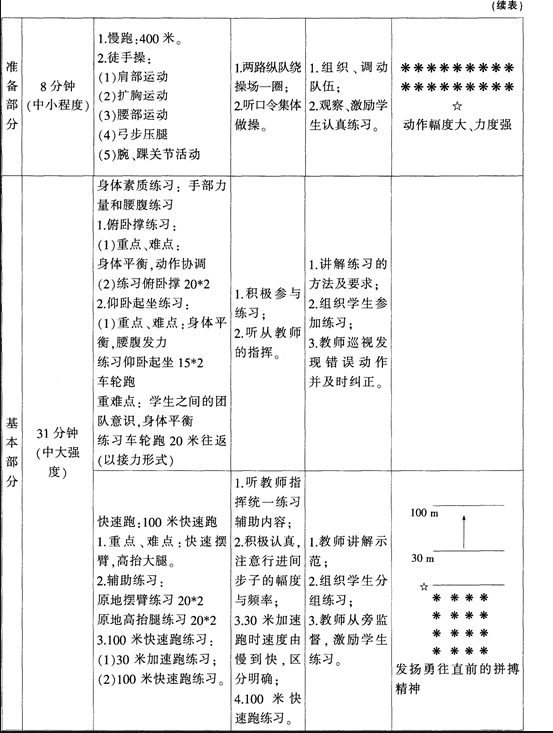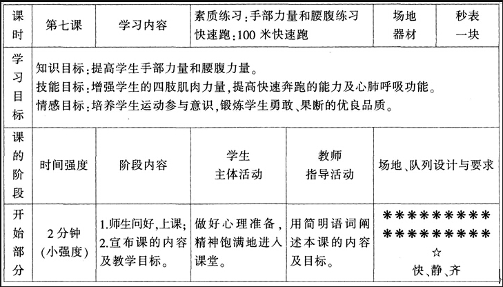 教学内容:手部力量和腰腹练习,100米快速跑。