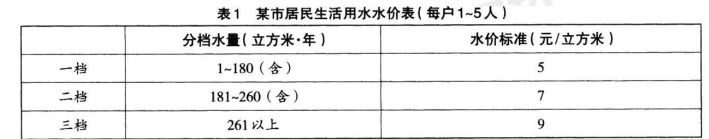 问答题 为倡导居民日常生活节约用水,某市居民生活用水实施阶梯水价制度见表 1。请用你熟悉的计算机语言,设计 一个程序,计