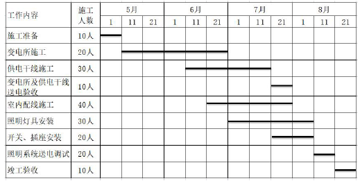 2.7 月下旬工作应该对供电干线的人数进行调整,调整后的人数为(4×31/5=24 人),现场的工作有:供电干线(24 人)、室内配线施工(40 人)、照明灯具安装(30 人)和开关、插座安装的工作人员(20 人),因此共有施工人员:24+40+30+20=114 人。