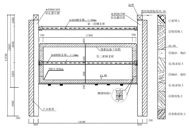 (2)在缺陷处插入引流管引流,然后采用双快水泥封堵缺陷处,等封堵水泥形成一定强度后再关闭导流管。如果渗漏较为严重,直接封堵困难时,则应首先在坑内回填土封堵水流,然后在坑外打孔灌注聚氨醋或双液浆等封堵渗漏处,封堵后再继续向下开挖基坑。