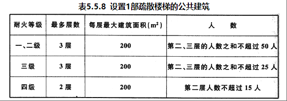 《建筑设计防火规范》规定:公共建筑内每个防火分区或一个防火分区的每个楼层,其安全出口的数量应经计算确定,且不应少于2个。设置1个安全出口或1部疏散楼梯的公共建筑应符合下列条件之一:①除托儿所、幼儿园外,建筑面积不大于200m2且人数不超过50人的单层公共建筑或多层公共建筑的首层;②除医疗建筑,老年人照料设施,托儿所、幼儿园的儿童用房,儿童游乐厅等儿童活动场所和歌舞娱乐放映游艺场所等外,符合表5.5.8规定的公共建筑。