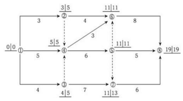 某工程双代号网络计划中各节点的最早时间与最迟时间如下图所示,该计划表明()。