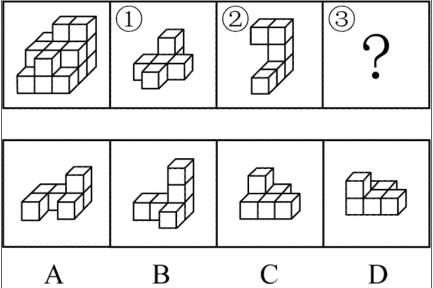 左图给定的是由相同正方体堆叠而成的多面体,该多面体可以由①、②和③三个多面体组合而成,以下哪项能填入问号处?