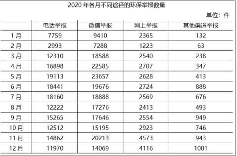 资料分析 020年12月,全国“12369环保举报联网管理平台”共接到环保举报31156件,环比下降23.2%,同比下降