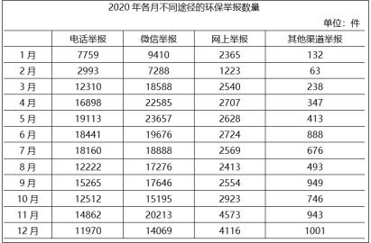 资料分析 020年12月,全国“12369环保举报联网管理平台”共接到环保举报31156件,环比下降23.2%,同比下降