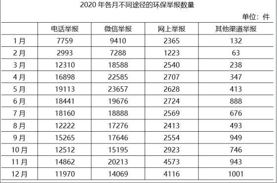 资料分析 020年12月,全国“12369环保举报联网管理平台”共接到环保举报31156件,环比下降23.2%,同比下降