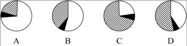以下哪个饼图最能准确反映2021年1—2月C市天然气用量中,民用气(白色)、CNG用气(黑色)和工业用气(斜线)的占比关系?