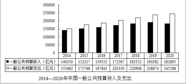 2020年中国一般公共预算收入为182895亿元,较2019年减少了7487亿元;一般公共预算支出为245588亿元,较