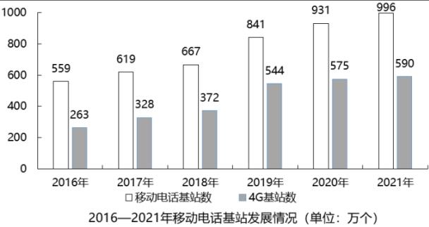 2021年,全国移动通信基站总数达996万个,全年净增65万个。其中4G基站达590万个,5G基站为142.5万个,全年