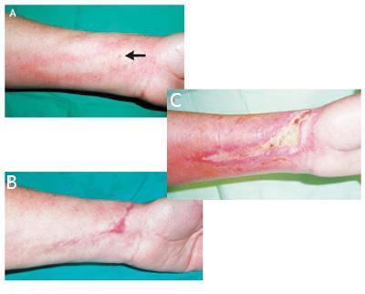图片题 患者,女,30岁,由于长时间输入高浓度液体引起留置针眼处红肿一大片,如图所示,该患者可能发生了( )