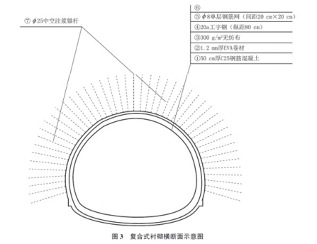 案例题 某隧道为上、下行双线四车道隧道,其中左线长858m,右线长862m,隧道最大埋深98m,净空宽度9.64m,净空高度6.88m,设计车速为100km/h。其中YK9+928~YK10+004段为Ⅴ级围岩,采用环形开挖留核心土法施工,开挖进尺为3m。该段隧道复合式衬砌横断面示意图如下图所示,采用喷锚网联合支护形式,结合超前小导管作为超前支护措施,二次衬砌采用灌注混凝土,初期支护与二次衬砌之间铺设防水层。