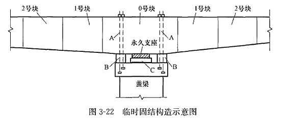 A为支座两侧临时锚固钢筋,B为临时支座,C为垫石。