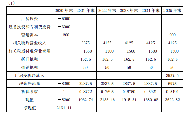 (5)假设厂房设备和专利技术使用费相关支出发生在 2020 年末,各年营业现金流量均发生在当年年末。