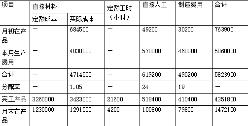 完工产品直接材料成本=3260000×1.05=3423000(元) 月末在产品直接材料成本=1230000×1.05=1291500(元)