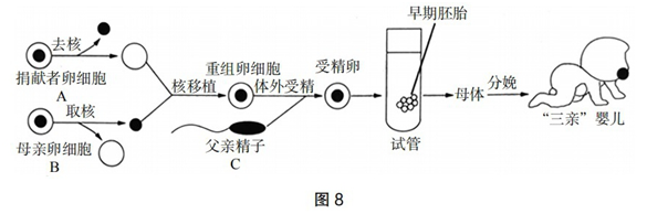 (3) “三亲”婴儿的遗传物质绝大部分来自母亲卵细胞的细胞核,还有少量来自捐献者卵细胞的细胞质,即A、B细胞均有为“三亲”婴儿提供遗传物质;