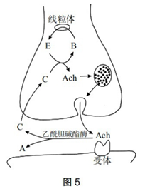 本题主要考查突触的结构和功能。根据新的材料背景,运用突触相关的知识解决问题。(1)乙酰胆碱是一种神经递质,在神经元的胞质中合成并储存在突触小泡中。乙酰胆碱通过胞吐的方式,由突触前膜释放,作用于突触后膜,与突触后膜上的特异性受体结合,从而进行信息传递。(2)由题图可以看出,在乙酰胆碱酯酶的催化下,乙酰胆碱被分解为A和C,其中C物质箭头向上重新进入突触小体,被用于合成细胞内的乙酰胆碱,因此被重复利用的物质是C。VX神经毒剂可以迅速与乙酰胆碱酯酶结合,从而使乙酰胆碱酯酶失去功能,无法分解乙酰胆碱,导致乙酰胆碱积累。(3)丁酰胆碱酯酶在人体内的含量非常低,可以通过基因工程技术大量生产。