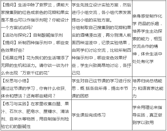 ③情感态度与价值观:自制酸碱指示剂。并设计和完成有关的实验。进一步增强对化学现象的探究欲望,培养善于合作、勤于思考的科学精神,逐步树立认识来源于实践的观点。