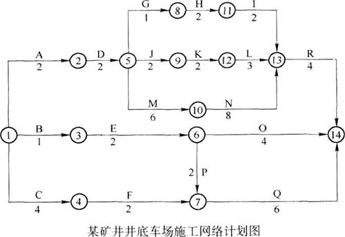 井底车场施工网络计划的关键线路和工期可通过网络计算求得。计划工期为2+2+6+8+4=22个月,施工中重点应控制的工程是关键线路的各项工程,具体是:A、D、M、N、R。