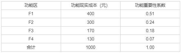 采用价值工程方法进行既有产品设计改进时,经分析得出的产品功能现实成本和功能重要性系数如下表所示,则功能区F1-F4 的功