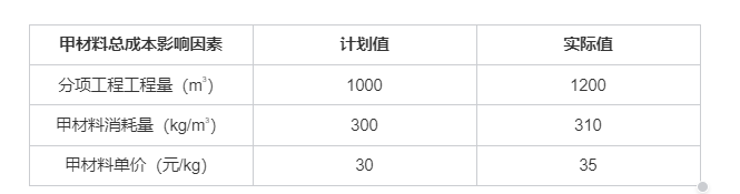 某分项工程工程量及该分项工程所包含的甲材料消耗量与单价的计划值和实际值如下表。用因素分析法进行施工成本分析时,甲材料消耗