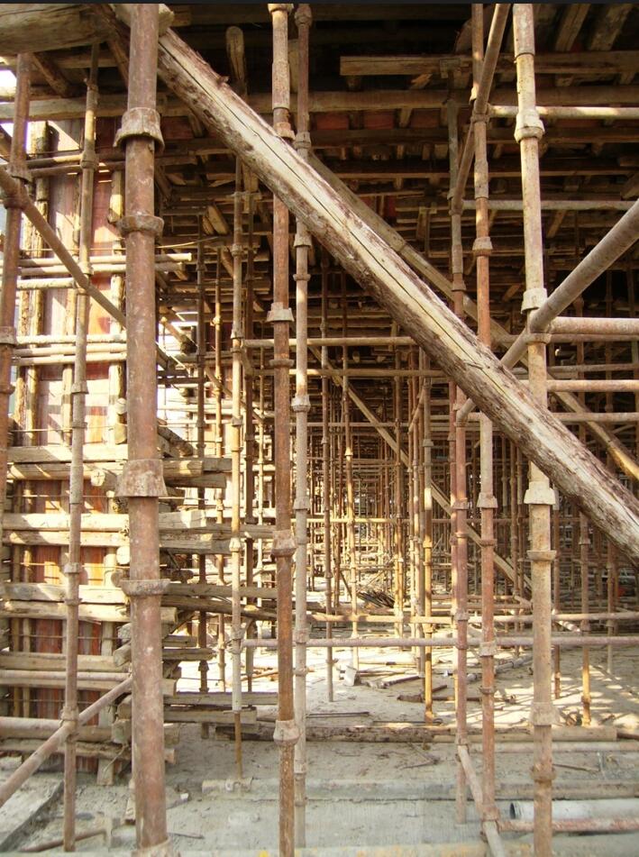 389.图为模板支撑图片,下列关于该模板支撑说法正确的是()。(多选题)扣接钢管等材料形成网格,然后再铺上脚手板才符合要