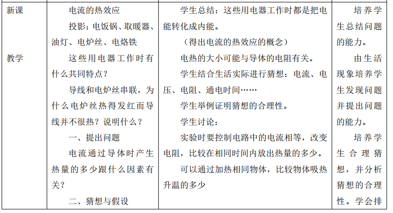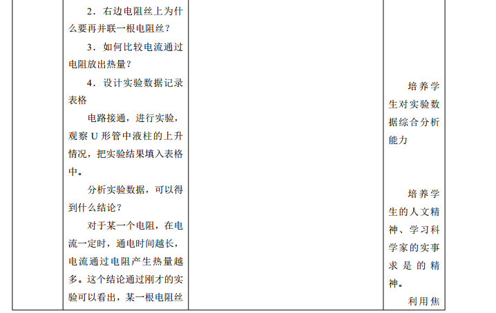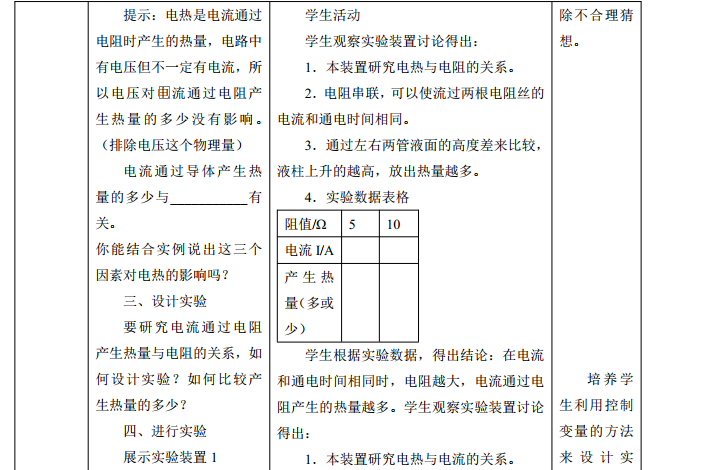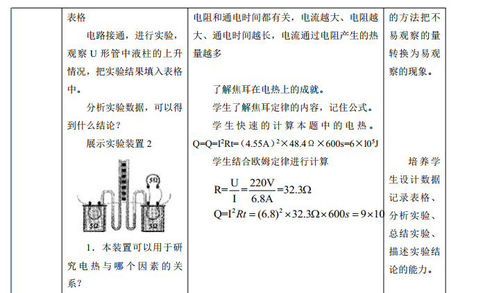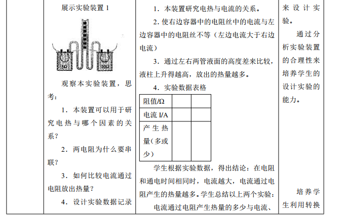 重点:通过实验研究电热与电流、电阻和通电时间的关系,并确定研究方法及实验操作中各个