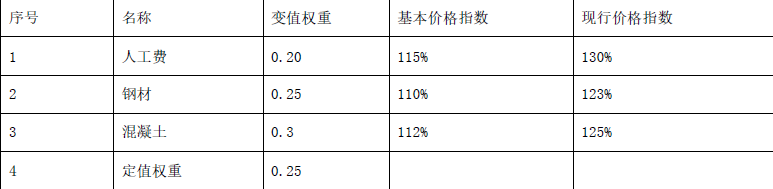 某工程约定采用价格指数法调整合同价款,承包人根据约定提供的数据如下表。本期完成合同价款为800万元,其中已按现行价格计算