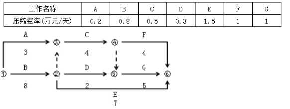 对下面双代号网络图进行工期优化,当各工作压缩费率如下所示时,欲压缩总工期 1 天,应当选择()进行压缩。