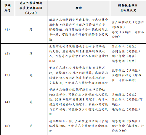 要求:针对资料一第(1)至(5)项,结合资料二,假定不考虑其他条件,逐项指出资料一所列事项是否可能表明存在重大错报风险。如果认为可能表明存在重大错报风险,简要说明理由,并说明该风险主要与哪些财务报表项目的哪些认定相关(不考虑税务影响)。